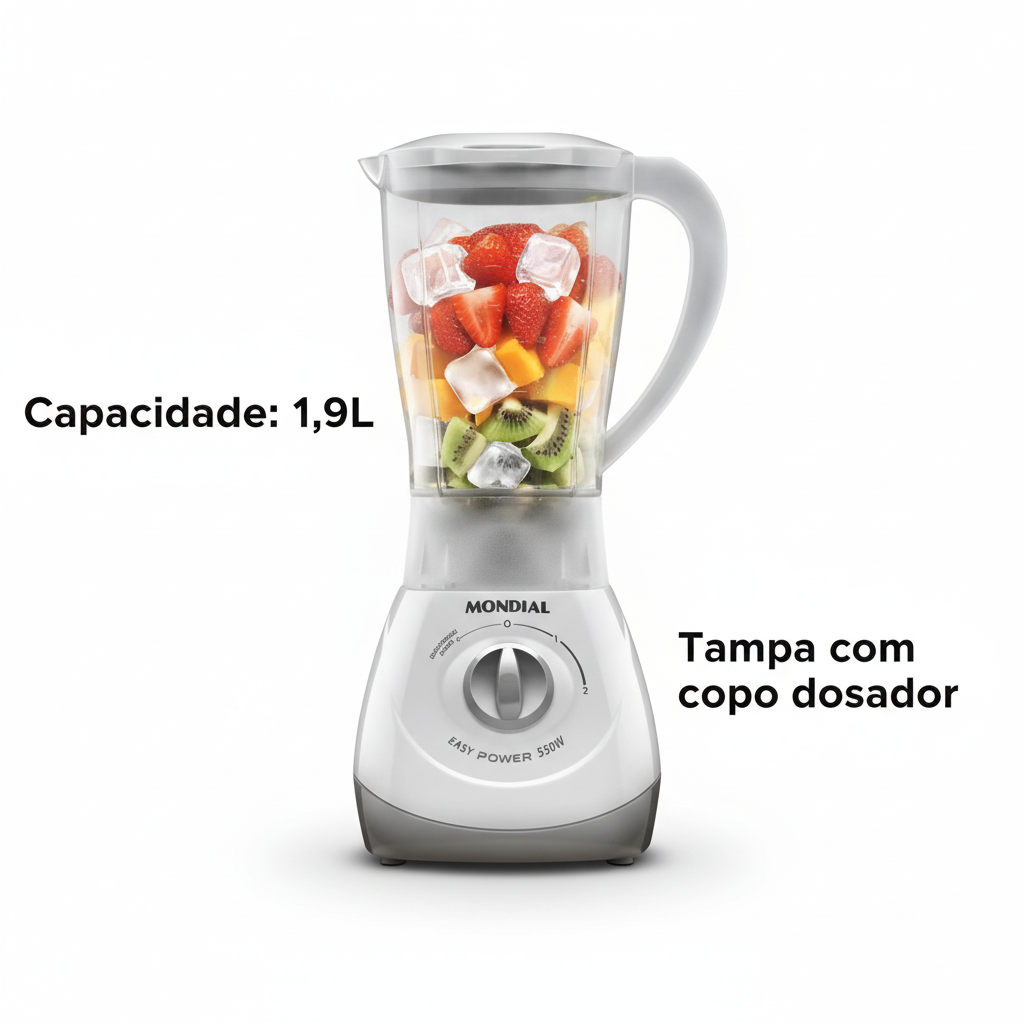 Transforme ingredientes em preparações homogêneas com um sistema que combina potência de 550W e capacidade generosa de 1,9 litros. O design pensado para o dia a dia oferece controle preciso através de múltiplas velocidades, permitindo ajustar a intensidade conforme a textura desejada — de smoothies cremosos a sopas aveludadas.
